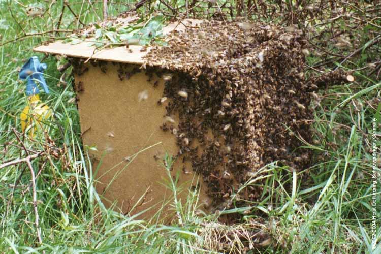 Nach dem Einschlagen des Schwarms ziehen die restlichen Bienen in den Kasten ein