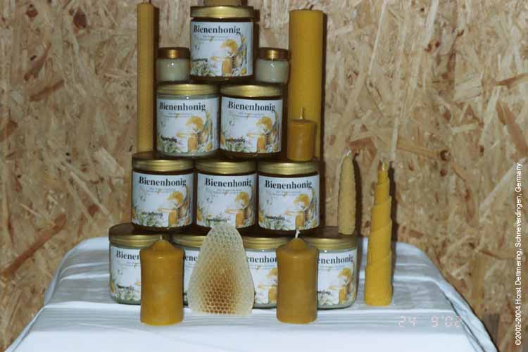 | Dank der Bienen Arbeit steht nach guter Tracht ausgezeichneter Honig zur Verfügung, überschüssiges Wachs wurde zu Kerzen verarbeitet | |||